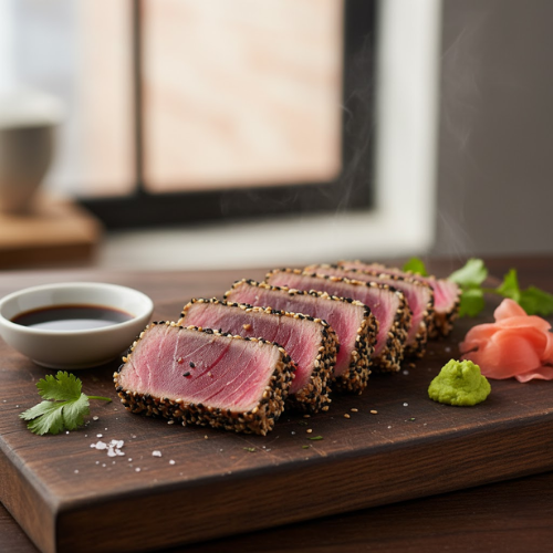 - Servir: Sirve el atún sellado inmediatamente. Puedes acompañarlo con un poco de salsa de soja, wasabi o jengibre encurtido, o una ensalada ligera.
