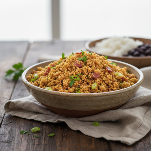 - Servir: Transfiere la farofa a un recipiente y sírvela caliente como acompañamiento. Si lo deseas, decora con perejil fresco picado. Es deliciosa con frijoles, arroz, carnes asadas o guisos.