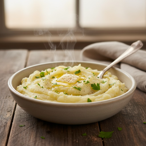- Servir: Sirve el puré de patatas caliente, idealmente con un poco de mantequilla extra por encima o decorado con perejil fresco picado.